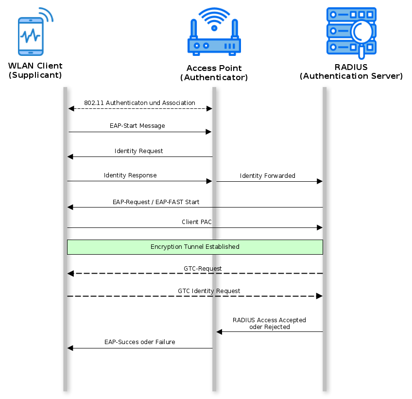 - Phase 0 (optional): Bereitstellen von den Protected Access Credential (PAC – vom Server generierte Credentials, die Informationen zu einen spezifischen Peer enthalten)