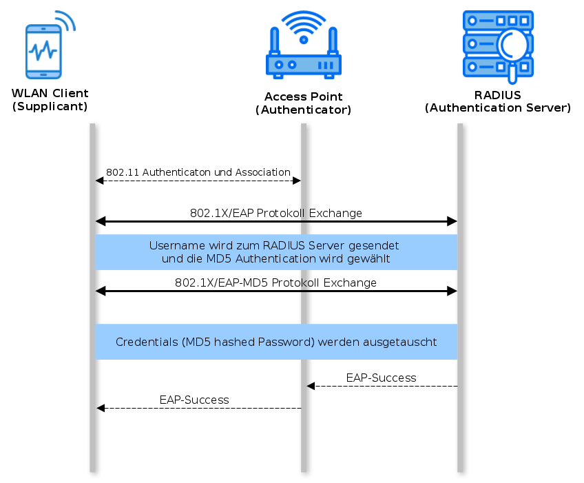 EAP-MD5 sollte nur für Testzwecke verwendet werden, da es keine gegenseitige und getunnelte Authentifizierung durchführt. Es werden keine digitalen Zertifikate benötigt, dadurch entstehen mehrere Angriffsmöglichkeiten.