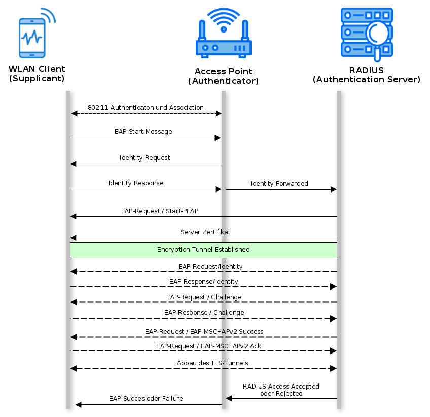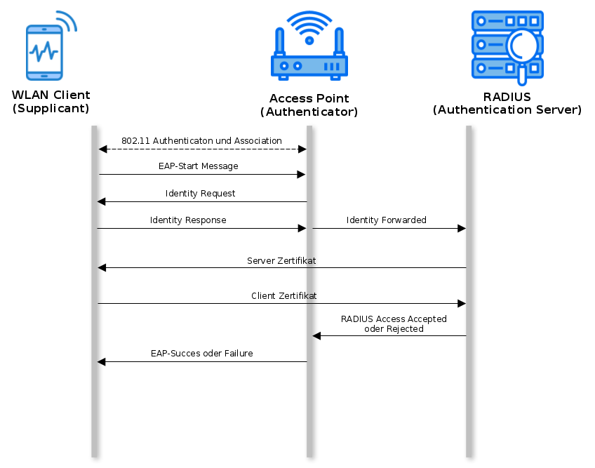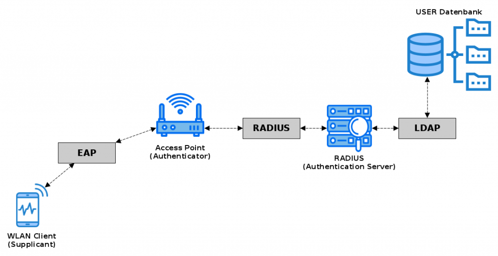 Bei einem WPA-Enterprise Netzwerk gibt es drei primäre Komponenten für eine Authentifizierung.