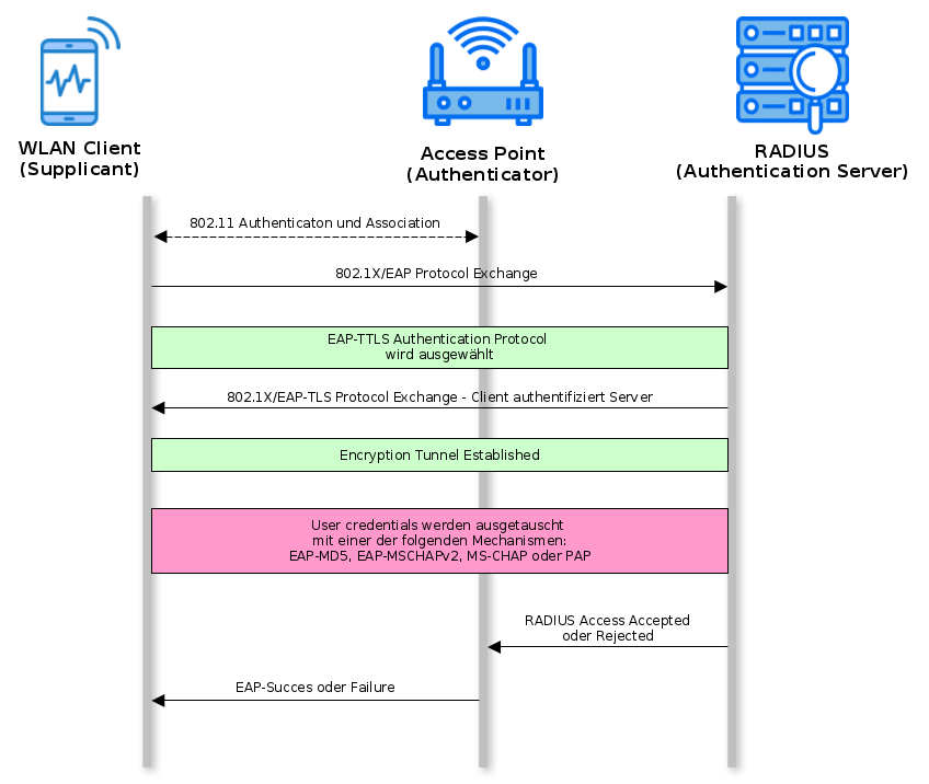 Beim Authentication Server wird meist ein sogenannter RADIUS Server verwendet. Der RADIUS Server validiert die Anmeldedaten vom User. Die Anmeldedaten werden von einer Datenbank (MySQL, LDAP) abgefragt und anschließend validiert.